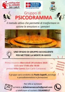 A San Carlo Canavese l’Associazione Alzheimer trasforma solitudine in comunità: laboratori (psicodramma, arteterapia, danzaterapia), Caffè del Buonumore, formazione e volontariato per sostenere malati e caregiver.