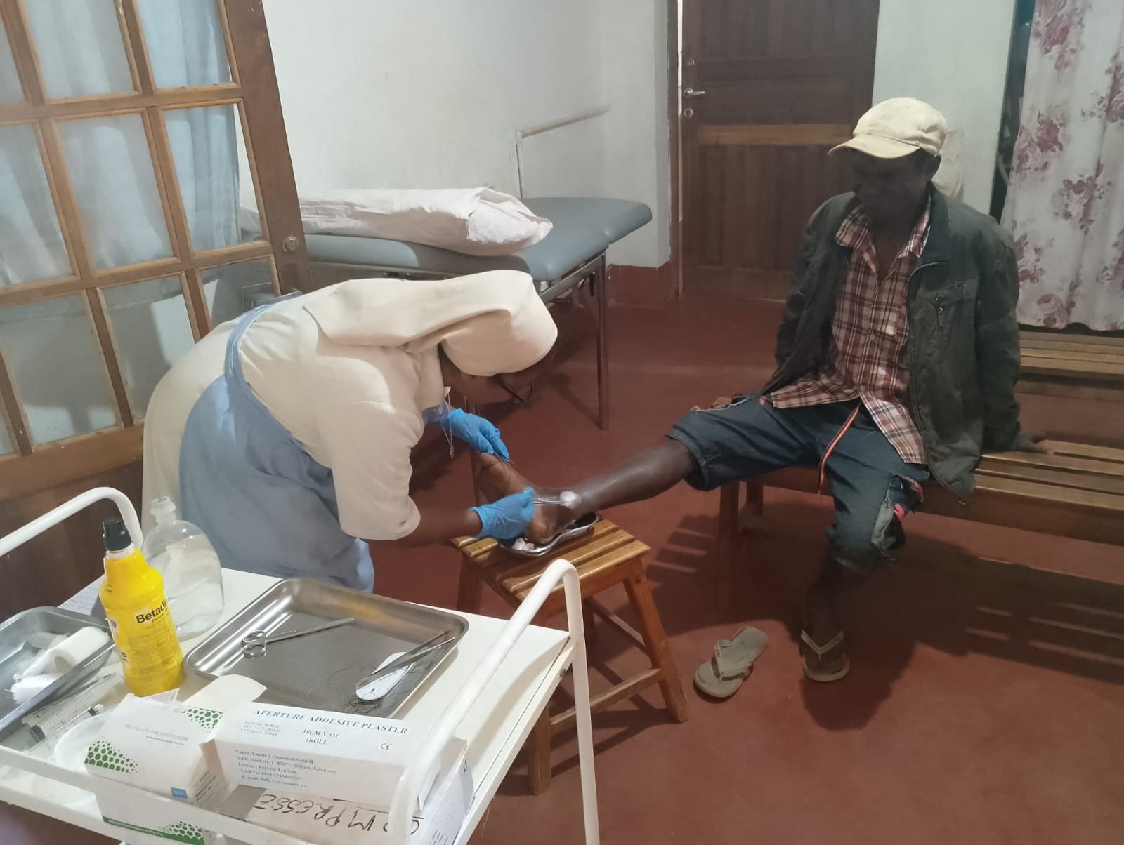 5 marzo 2026. Qualche immagine per dare idea degli spazi e del lavoro al Dispensario Medico. Questo malato si è presentato con febbre alta e infezione alla gamba. Sono molti gli interventi di questo tipo che richiedono di disinfettare, medicare e cucire le ferite.