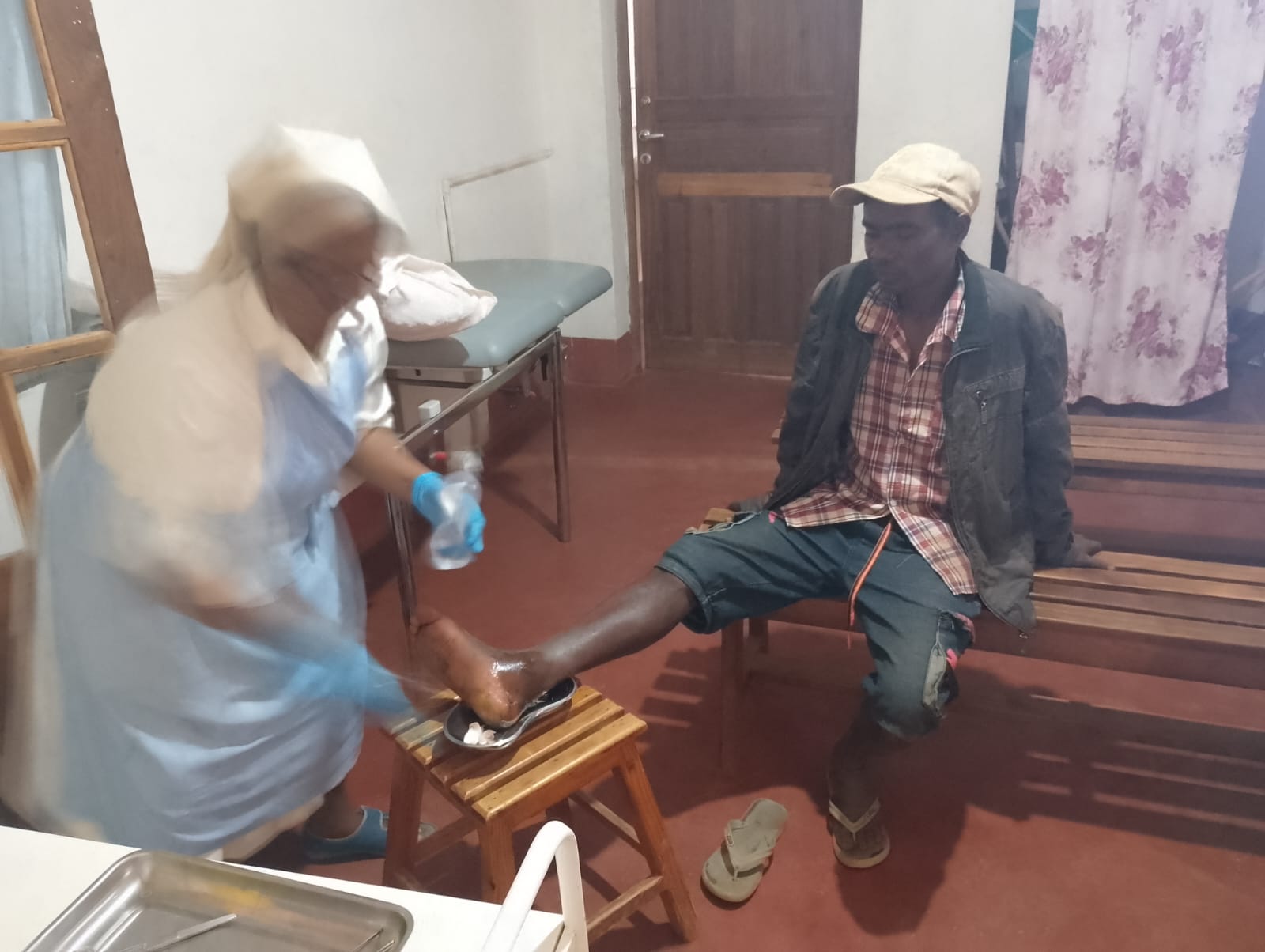 5 marzo 2026. Qualche immagine per dare idea degli spazi e del lavoro al Dispensario Medico. Questo malato si è presentato con febbre alta e infezione alla gamba. Sono molti gli interventi di questo tipo che richiedono di disinfettare, medicare e cucire le ferite.