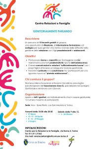 - Collaborazione nella gestione del Centro Relazioni e Famiglie del Comune di Torino attiva dal 2020 ed in corso: spazio di ascolto per genitori nel quale i professionisti offrono consulenza individuale e di gruppo gratuitamente. Clicca qui per visitare il sito!