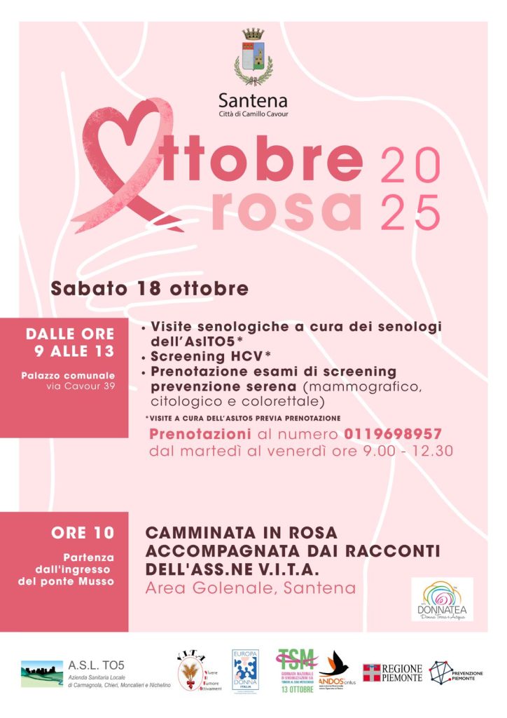 Il Comune di Santena conferma la propria adesione a Ottobre Rosa – il mese internazionale dedicato alla sensibilizzazione sul tumore al seno – con un programma costruito insieme ad ASL TO5 e alle associazioni V.I.T.A. ODV, ANDOS Carmagnola e DONNATEA: