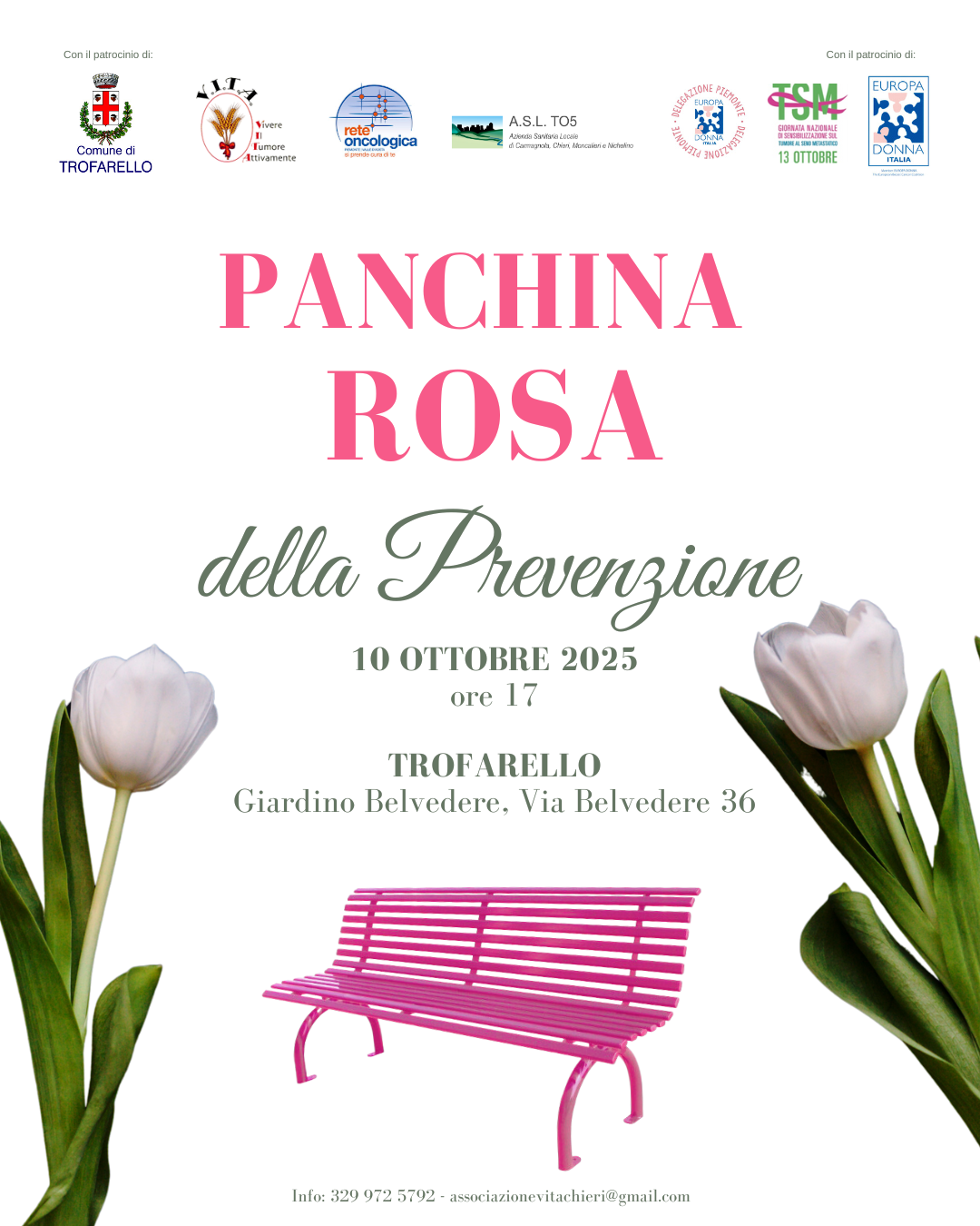 Venerdì 10 ottobre 2025 alle ore 17 V.I.T.A. OD inaugura a Trofarello la 25a panchina rosa della prevenzione.