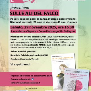 Vi aspettiamo alla premiazione decima edizione 2024 – 2025 Sabato, 29 novembre 2025, ore 16,30 Lavanderia a Vapore – Corso Pastrengo 51- Collegno (TO) SULLE ALI DEL FALCO tra versi sospesi, passi di danza,...