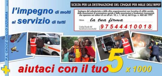 Aiutaci ad aiutare! Dona il tuo 5×1000 alla P.A. Croce Giallo-Azzurra ODV. Firma e inserisci il codice fiscale 97544410018.