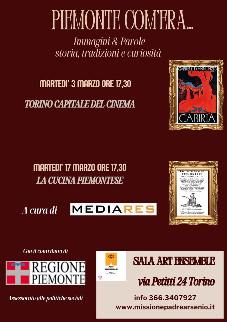 - DOMANI INIZIA CICLO DI INCONTRI PIEMONTE COM’ERA. 1.° TORINO CAPITALE DEL CINEMA.domani inizia il ciclo di incontri storie e immagini sul Piemonte: primo appuntamento Torino capitale del cinema da Cabiria al Torino Film Festival