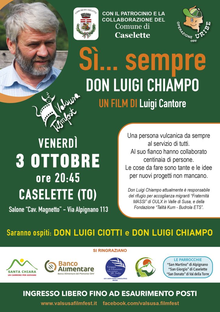 Verrà proiettato il Documentario sulla vita di un personaggio della nostra Valle di Susa: don Luigi CHIAMPO, un uomo che tanto ha fatto e sta facendo, per aiutare le persone più fragili. La sua forza, il suo passato, le sue idee, i suoi progetti realizzati e futuri. Tante idee e tante persone aiutate.